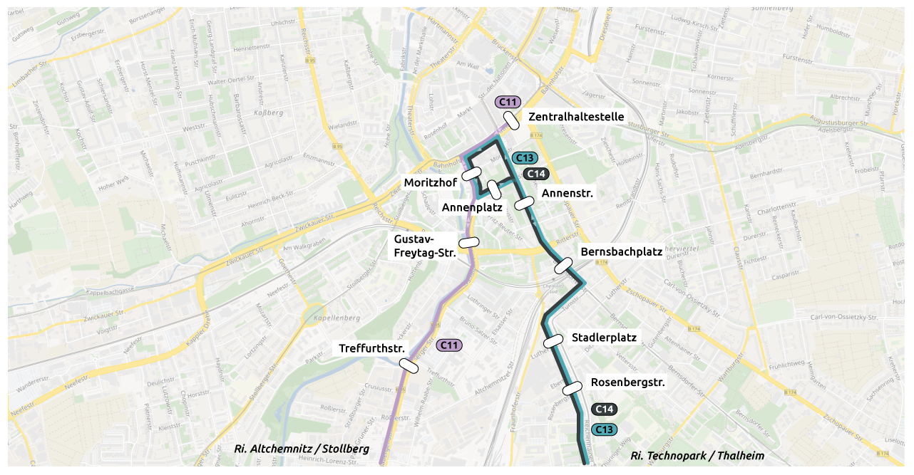 C13 | C14 Chemnitz Technopark Annenstraße > Moritzhof > Annenplatz (centre) > Technoparkrun from Technopark via Reitbahnstr. > Bahnhofstr. > Moritzhof > Annenstraße (Annenplatz stop) > back via Reitbahnstraße > continue as scheduled. All stops will be served