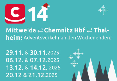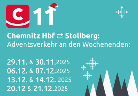 In order to get into the city and back home safely after a mulled wine or two, we are increasing our transport services at the Advent weekends by setting up additional train connections on our two main lines C11 (Chemnitz Stollberg) and C14 (Chemnitz Thalheim) at the most important times.